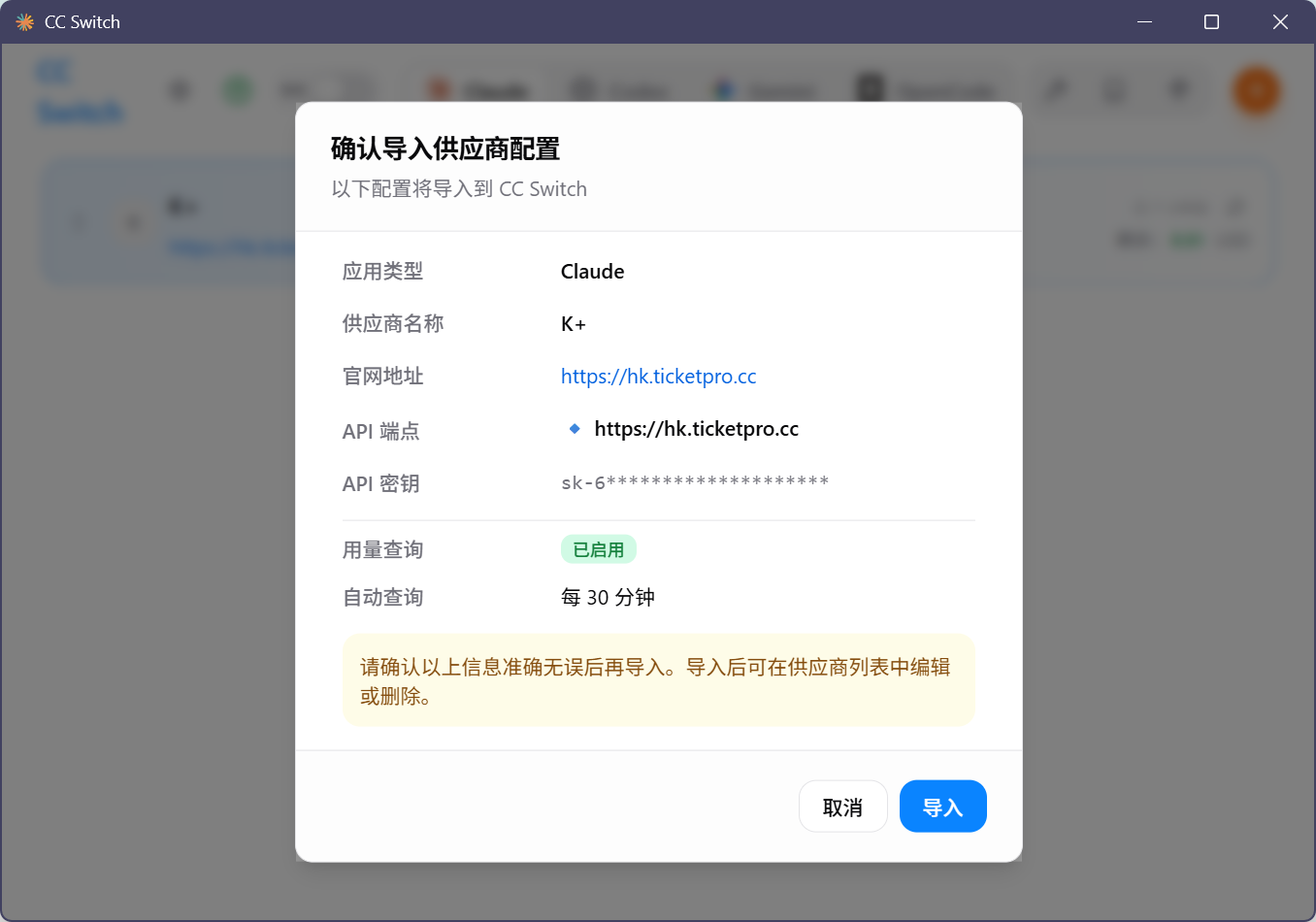 安装完成后,ccswitch 支持从中转站后台直接一键导入配置,无需手动复制 Key 和地址。
