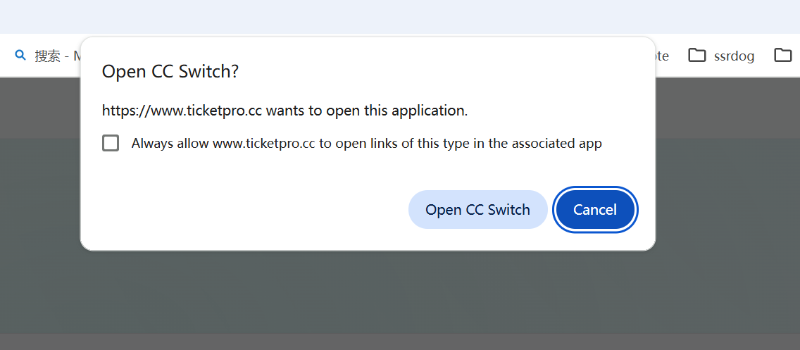 - 在 ccswitch 弹出的确认窗口中,选择要配置的工具(Claude Code 或 Codex),确认导入