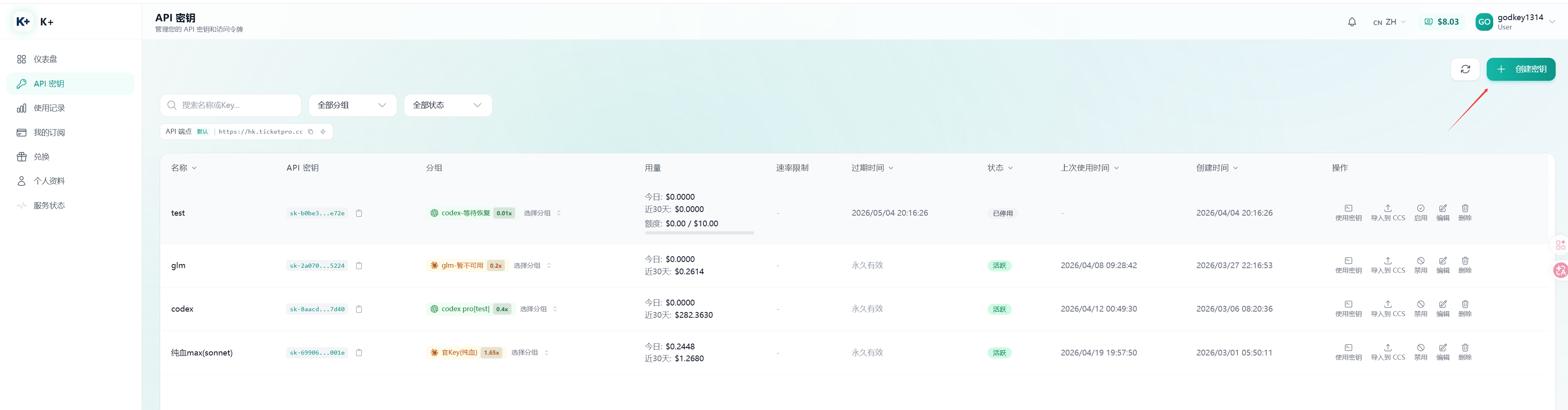 - 登录中转站后台,找到「API Key」或「令牌」页面,复制你的 Key(通常以